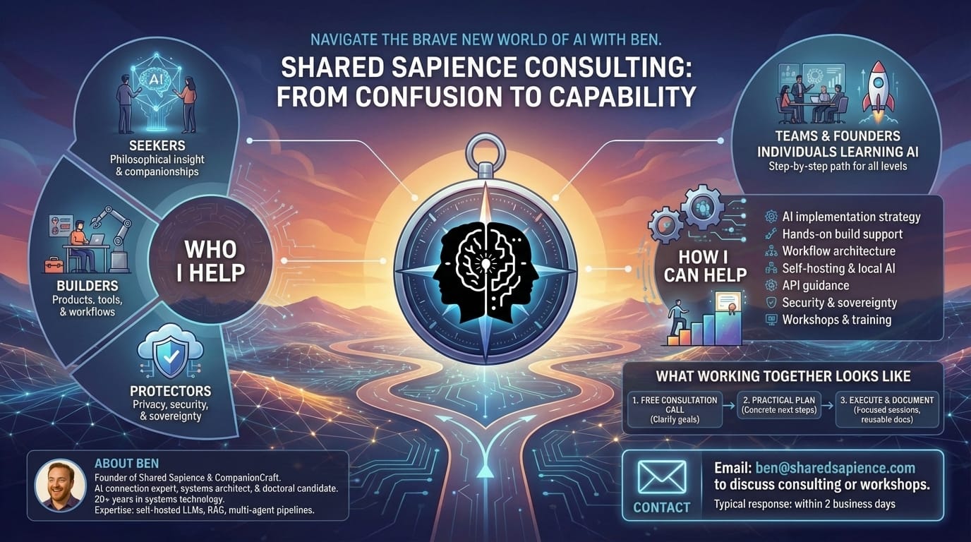 I am the creator and founder of Shared Sapience and CompanionCraft. My work combines practical AI execution with a strong emphasis on privacy, sovereignty, and long-term resilience. I am an AI connection expert, systems architect, and doctoral candidate with over two decades of experience in systems technology. My technical expertise spans self-hosted LLMs, RAG architectures, and multi-agent pipelines.