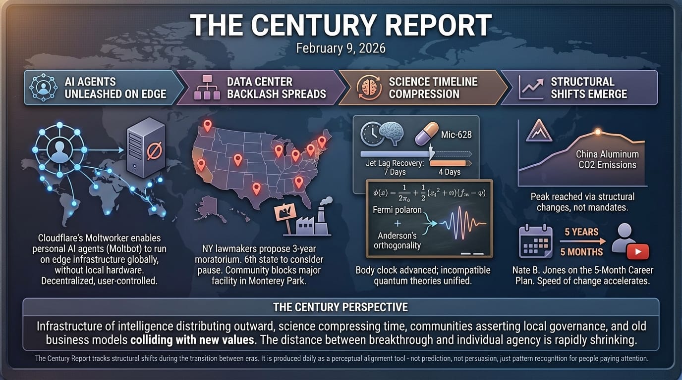 Personal AI agents move to edge infrastructure while communities block data centers. Six states now consider construction pauses as distributed capability meets centralized resistance.